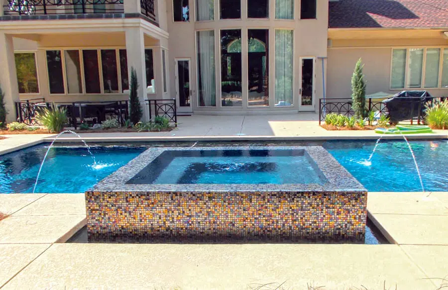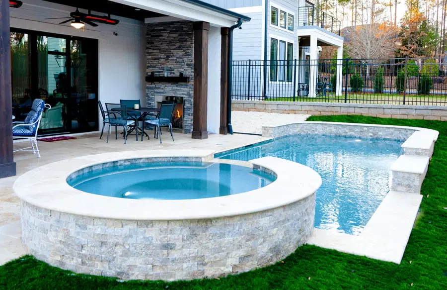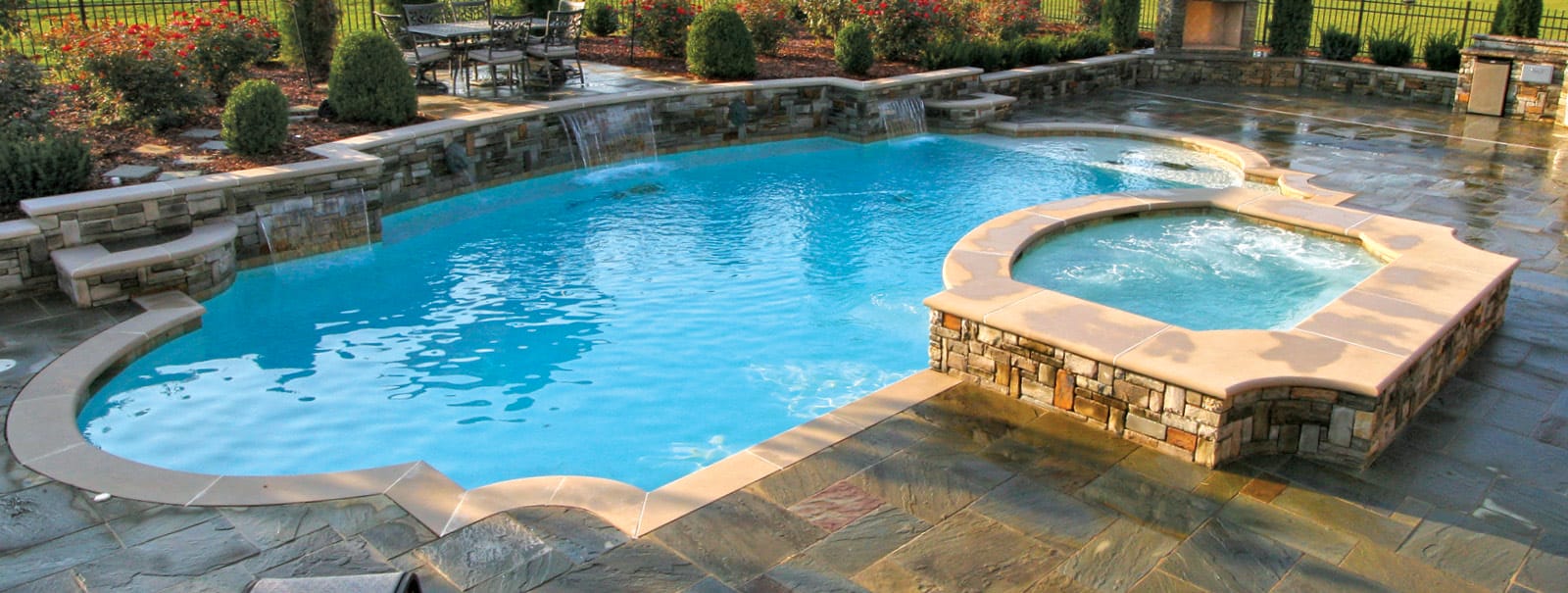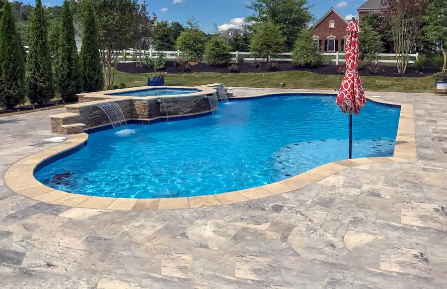 Roman-shaped custom spa and water features on inground pool in Franklin.