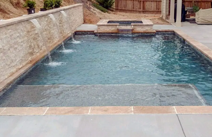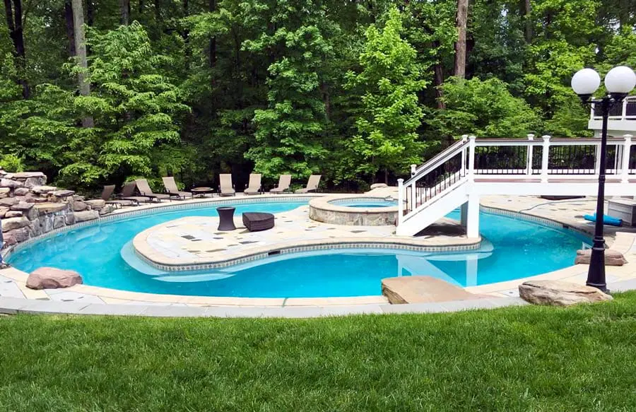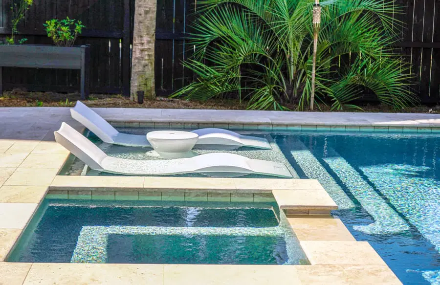Rectangle swimming pool with lounge chairs on tanning ledge and curvy pool with bubbler fountains on entry step.