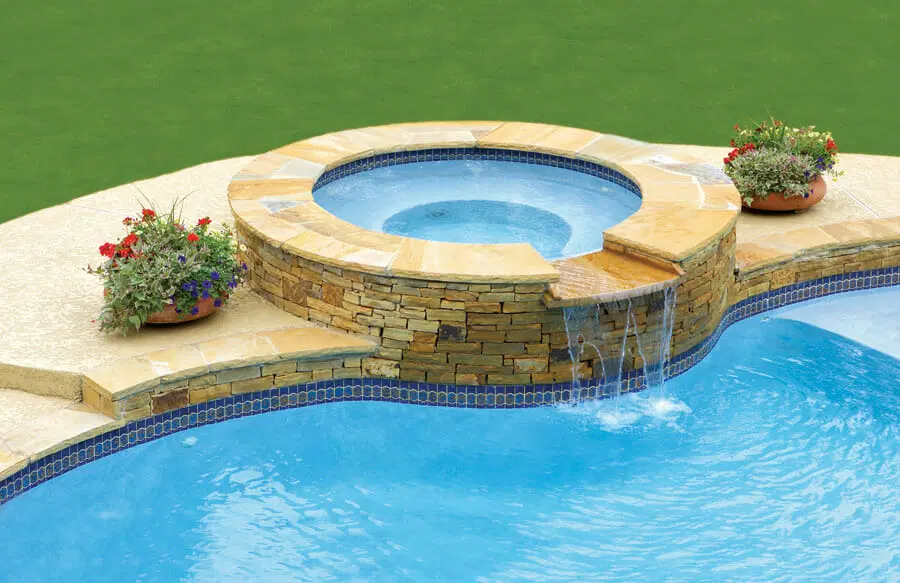 Gunite spa with flagstone exterior on custom pool in Rogers.